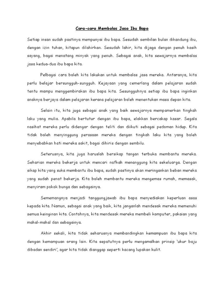 Setiap anak mungkin tidak mampu membalas jasa ibu bapa yang telah membesarkan anda sehingga berjaya. Namun, lakukan cara ini sebagai tanda terima kasih. Saya lebih sering mendengar nak mau nikah sama anak bapa/ibu ga?. Seorang ibu pun akan setengah mati merawat anaknya agar tetap sehat. Membalas jasa ortu jangan selalu diartikan dengan cara memenuhi kebutuhan lahiriah. Menunjukkan bakti kita kepada orang tua merupakan salah satu cara untuk membalas jasa mereka yang tak terhitung jumlahnya. Belajar yang tekun adalah cara untuk membalas kebaikan orang tua.